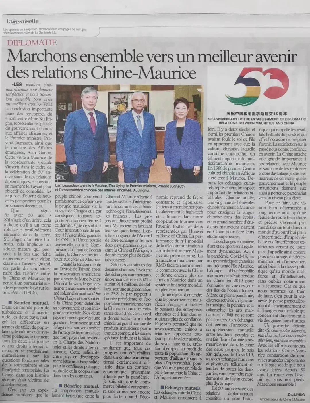 结合近期台海局势和日前中国政府非洲事务特别代表许镜湖访问毛里求斯,驻毛里求斯大使于8月8日在毛主流媒体《挑战报》《快报》《毛人报》发表题为《携手同行,构建中毛两国关系美好未来》的署名文章。