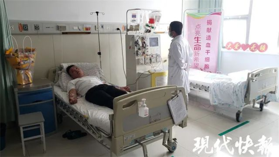 8月2日上午9时许,通过连续4天注射动员剂后,周建华躺在连云港市第一人民医院血液科的采集床上,两个手臂都上插着管子,经过4个多小时采集,血细胞分离机成功从其体内采集到了256毫升的造血干细胞混悬液。