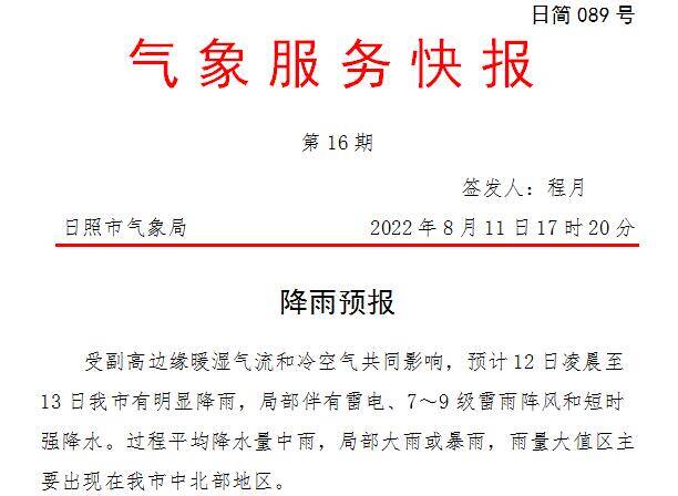 齐鲁网·闪电新闻8月11日讯 受副高边缘暖湿气流和冷空气共同影响,预计12日凌晨至13日日照市有明显降雨,局部伴有雷电、7~9级雷雨阵风和短时强降水。过程平均降水量中雨,局部大雨或暴雨,雨量大值区主要出现在日照市中北部地区。