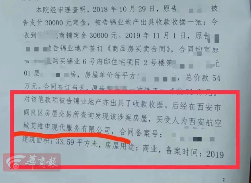 2019年3月,齐先生向阎良区法院提起诉讼。判决书显示,经在西安市阎良区房屋交易所查询发现该涉案房屋,买受人为西安航空城艾维申现代服务有限公司,备案时间为2019年2月3日。法院判决齐先生与开发商解除商品房买卖合同,开发商返还54万元购房款,并支付赔偿款54万元。