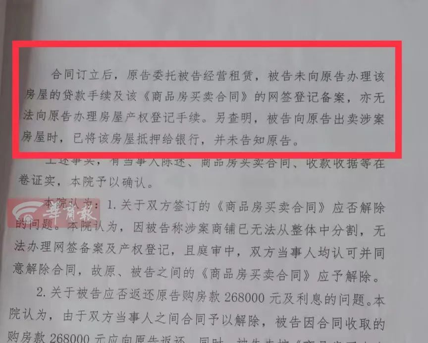 齐先生说:“直到拿到判决书,我才知道被‘一房两卖’了。”尽管法院作出了判决,但因开发商名下无财产,导致法院无法强制执行,“到现在已经三年多了,我既拿不到商铺,也追不回钱款。”