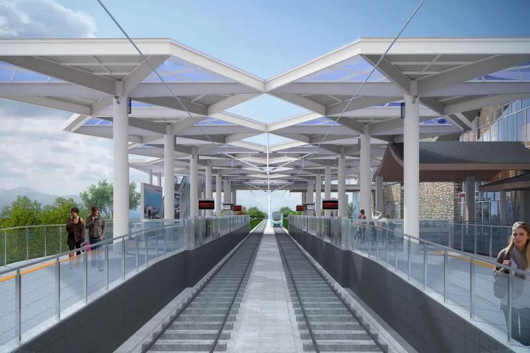 而且,全线设有5座车站,设计均结合了丽江历史文化和风土人情,如白沙古镇站—画壁,取其壁纸形态融入站台设计。有画廊将连续的廊架以壁画的形式呈现,结合侧式站台的特点,犹如将人包容其中。
