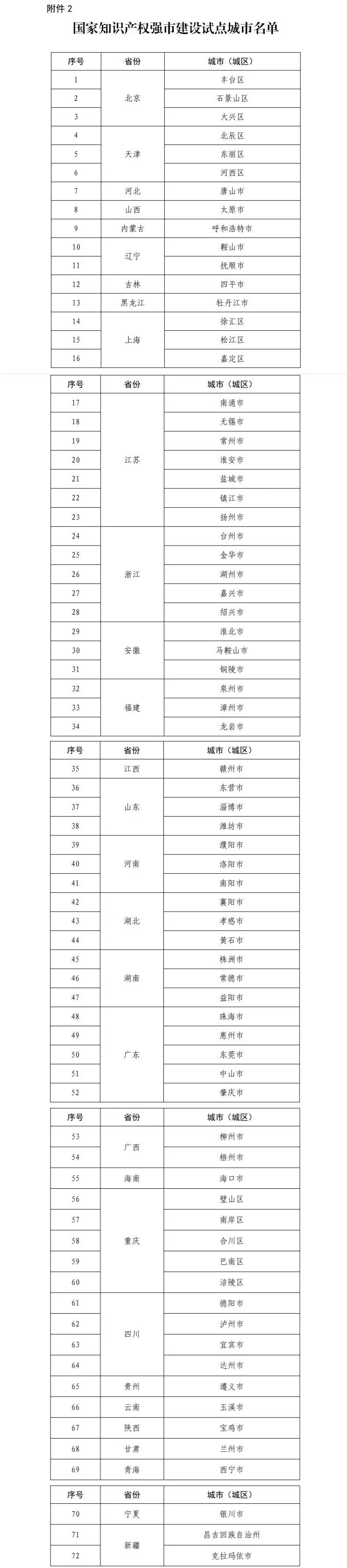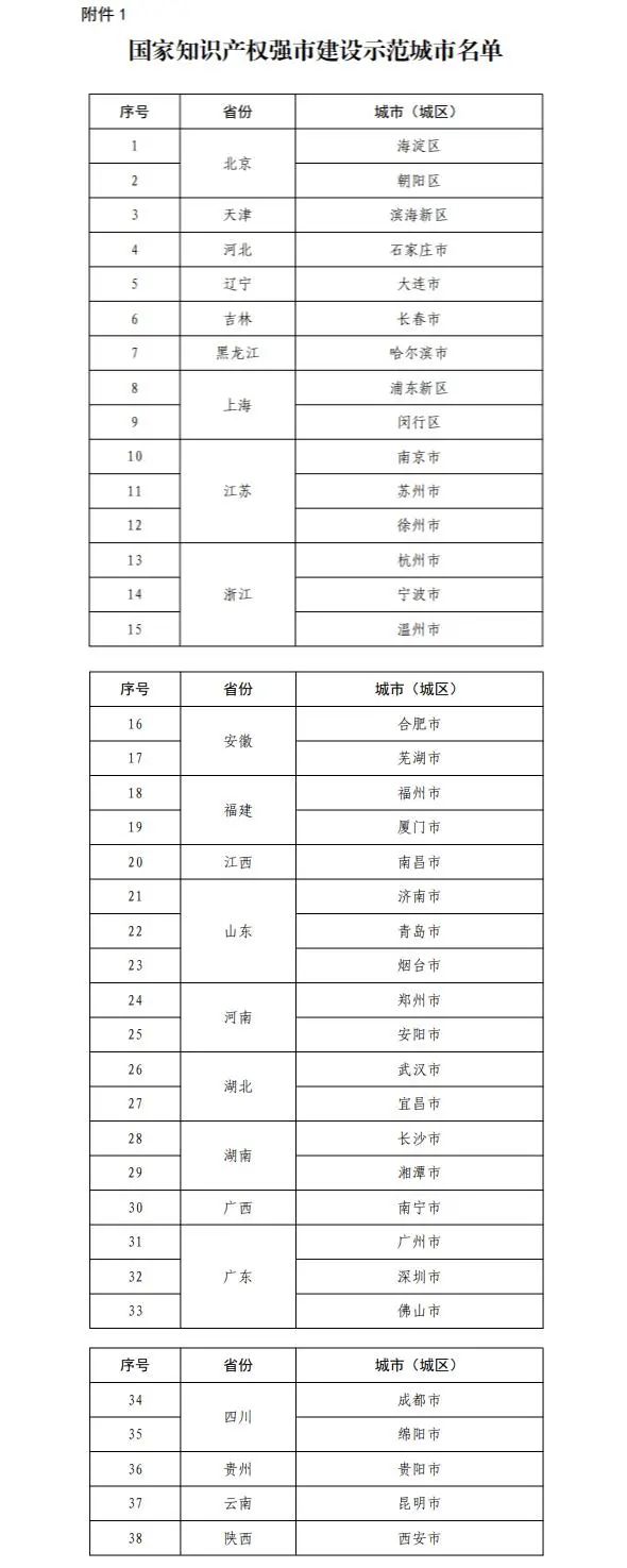 8月11日,国家知识产权局网站发布《国家知识产权局关于确定国家知识产权强市建设试点示范城市的通知》,按照《国家知识产权局办公室关于面向城市、县域、园区开展知识产权强国建设试点示范工作的通知》(国知办函运字〔2021〕1197号)要求,经地方申报推荐、材料审查、专家评审等程序,确定北京市海淀区等38个城市(城区)为国家知识产权强市建设示范城市,北京市丰台区等72个城市(城区)为国家知识产权强市建设试点城市,试点示范时限自2022年7月至2025年6月。