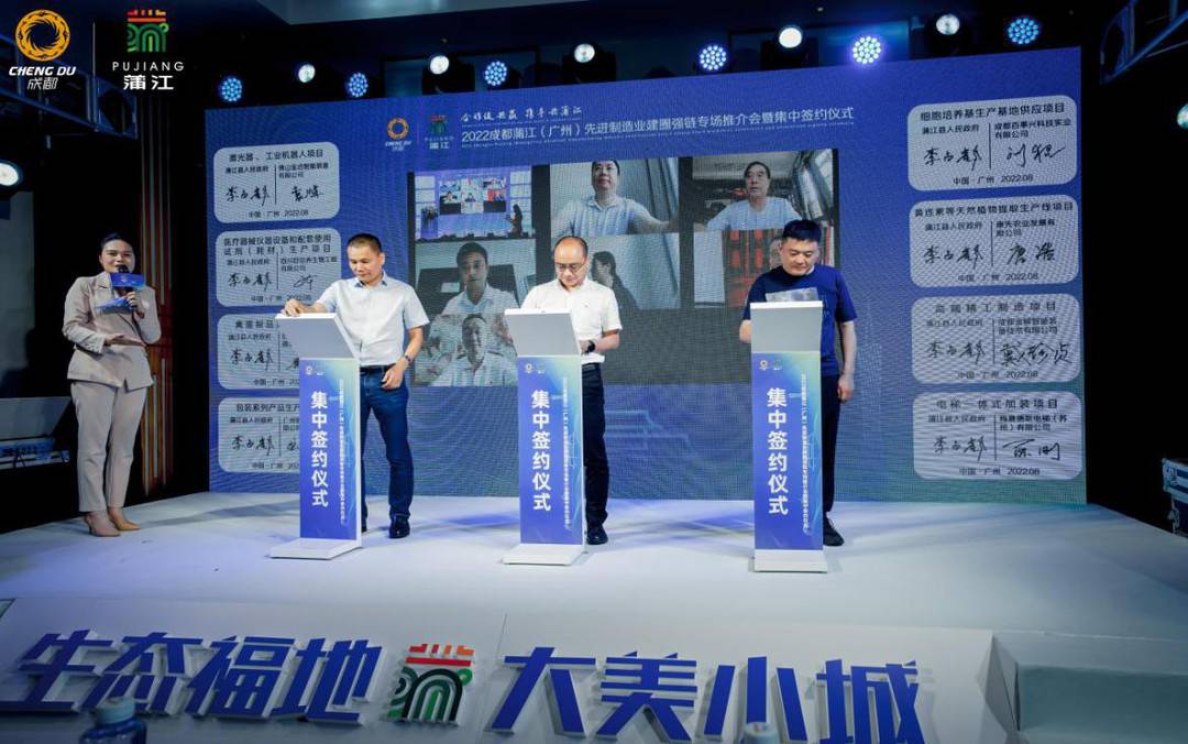 为加大产业“建圈强链”工作力度,打好新一轮先进制造业招商引资“百日攻坚”战,做优做强郊区新城核心功能蒲江范式,8月11日,由四川省人民政府驻广州办事处、成都市投资促进局、成都市人民政府驻深圳办事处指导,蒲江县人民政府主办,广东四川商会、泸定县人民政府协办的2022年蒲江(广州)先进制造业建圈强链专场推介会暨集中签约仪式在广州举行,40余家知名企业、商会代表“智”汇一堂,共商发展、共谋未来、共享机遇。四川省人民政府驻广州办事处主任王德胜、广东四川商会会长熊宗友出席并致辞。