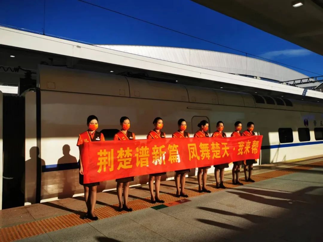 7点10分,旅客们开始检票进站。首发的C5627次列车共有8节车厢,约有120名旅客乘坐。在站台上,武汉客运段志愿者手持“荆楚谱新篇,凤舞楚天·我来帮”的横幅,载歌载舞。7点26分,列车准时开出。