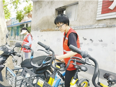 在市实验小学附近,穿着红色志愿者马甲的冯怡梦将共享单车一辆辆整齐摆放在停车线内,和这里的志愿者一起,清洁路面卫生、清理小广告等。