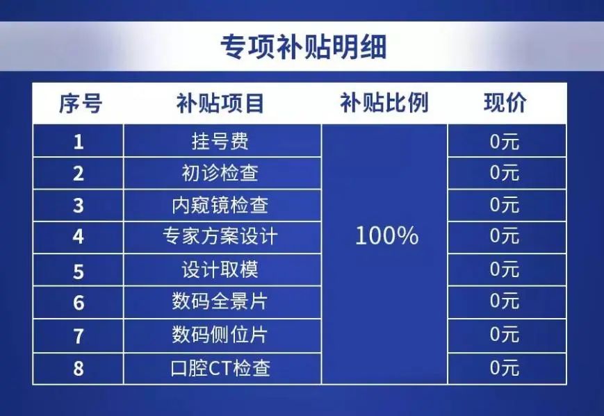 1. 八项全免:在武汉德亚口腔医院可享挂号费、建档费、专家诊疗费、数字化口腔健康检查费、种植牙/牙齿矫正拍片费(口腔CT/全景片)等全额优惠,即全部补贴。