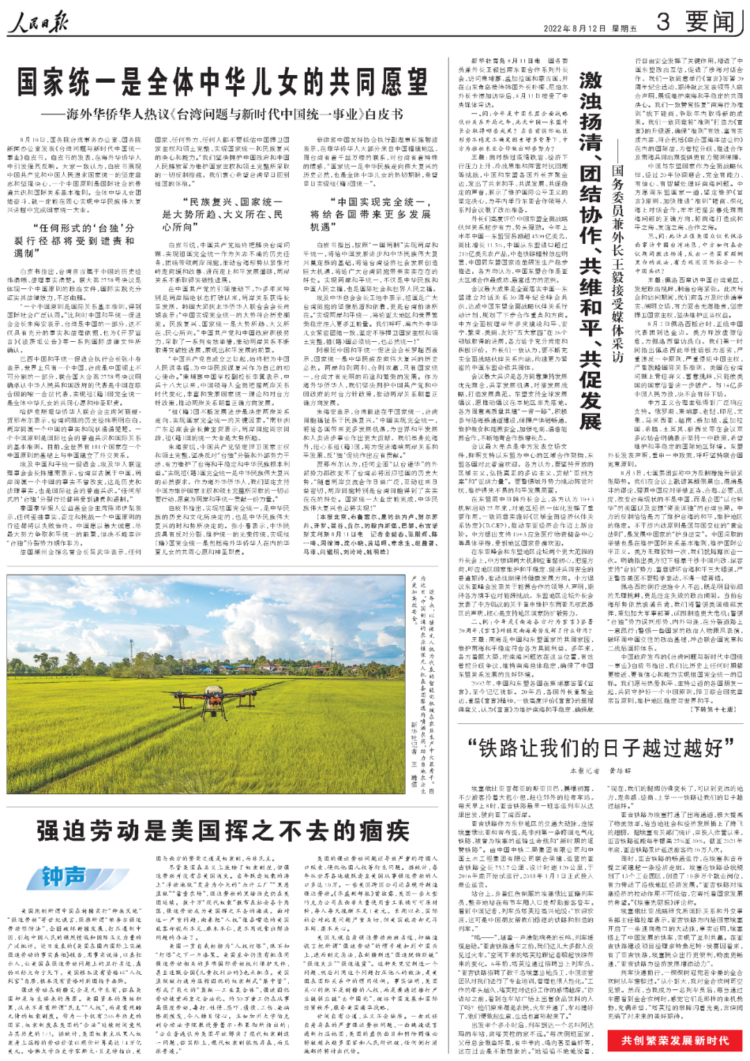 8月10日,国务院台湾事务办公室、国务院新闻办公室发表《台湾问题与新时代中国统一事业》白皮书。白皮书的发表,在海外华侨华人中引发强烈反响。大家一致认为,白皮书展现中国共产党和中国人民追求国家统一的坚定意志和坚强决心,一个中国原则是国际社会的普遍共识和国际关系基本准则。全体中华儿女团结奋斗,就一定能在同心实现中华民族伟大复兴进程中完成国家统一大业。