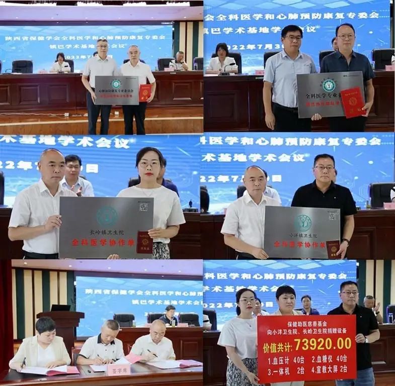 心肺预防康复专委会常务委员王琦和全科医学专委会秘书长张敏代表专委会分别向镇巴县中医院、镇巴县医共体办公室授牌并颁发聘书;镇巴县中医院向小洋、长岭两家协作单位授牌、颁发证书。陕西省保健学会公益项目部负责人田蓉代表保健助医慈善基金向小洋卫生院及长岭镇卫生院两家协作单位捐赠血压计、血糖仪、一体机、宣教大屏等合计73920元的设备。