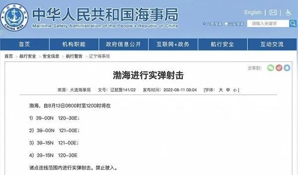 央视网消息:据中国海事局网站8月11日消息,大连海事局发布航行警告,自8月13日06时至12时,渤海部分海域进行实弹射击。禁止驶入。