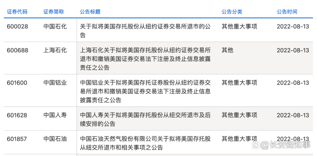 8月12日,5家中国企业——中国石油化工股份有限公司、中国石油天然气股份有限公司、中国铝业股份有限公司、中国人寿保险股份有限公司、中国石化上海石油化工股份有限公司同时发布公告,拟将美国存托股份从纽约证券交易所退市。