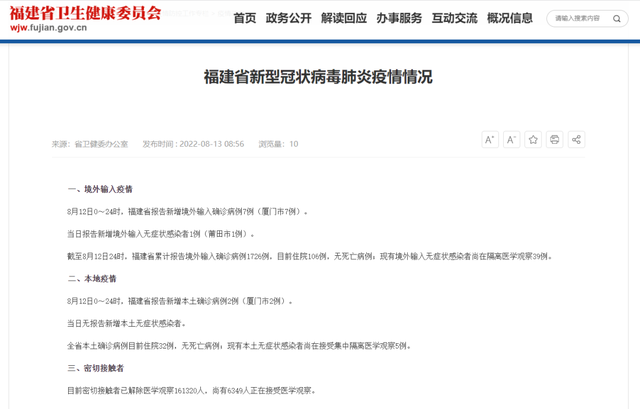 8月12日福建新增本土确诊病例2例