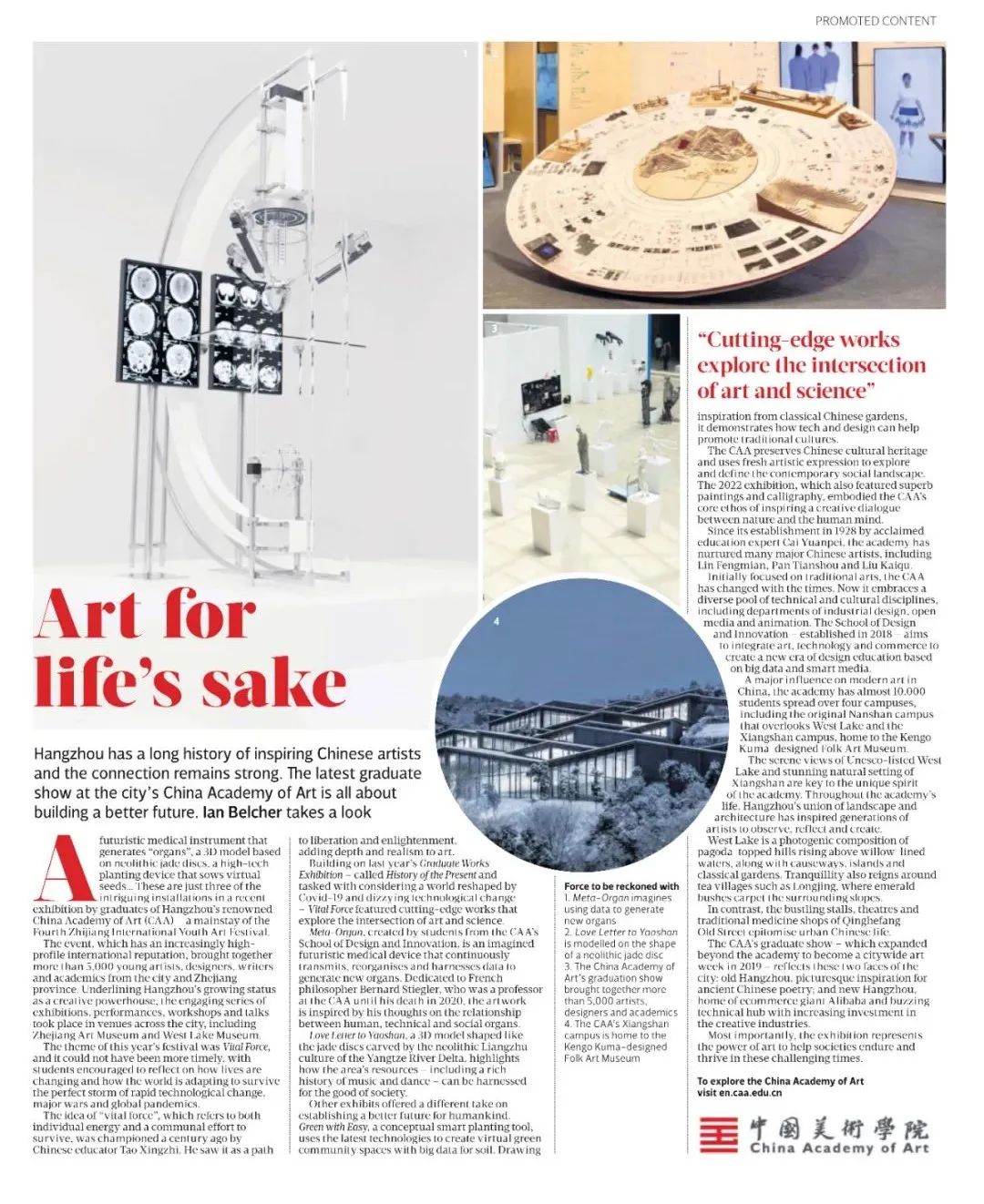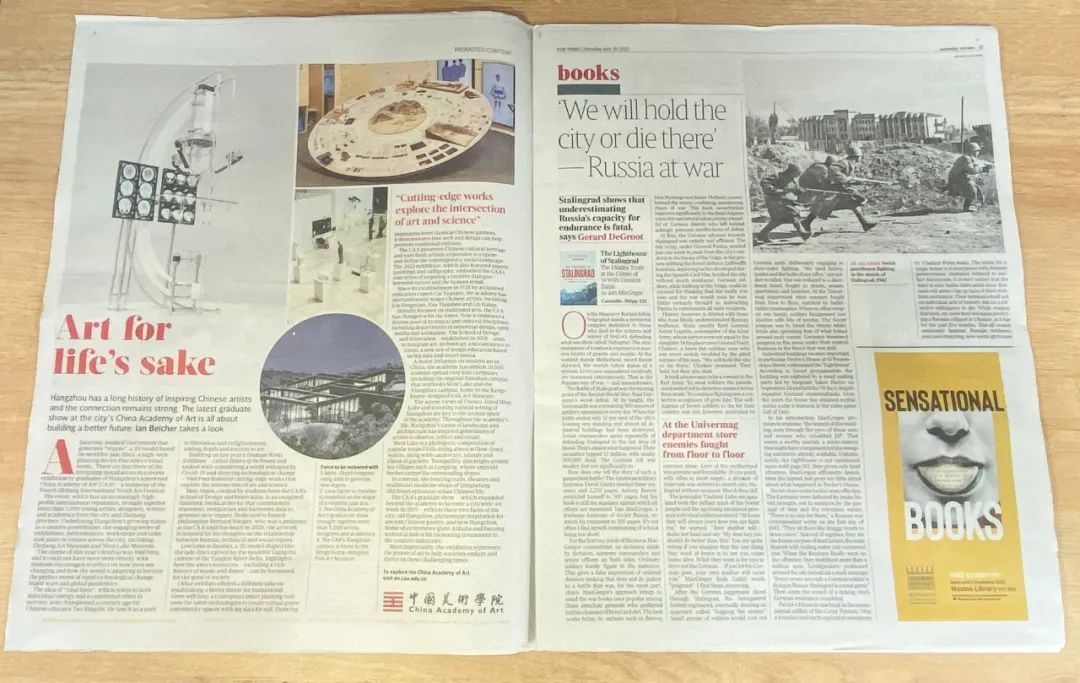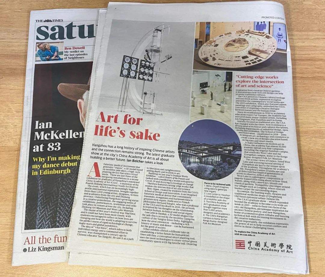 日前,英国主流媒体《泰晤士报》整版刊文“Art for life’s sake”(参考译文:因生活而艺术),报道中国美术学院2022届毕业作品展,透过“生活力”主题,观察中国高等艺术院校在艺术与科技融合方面的前沿探索,以及艺术助力城市发展的创新实践。