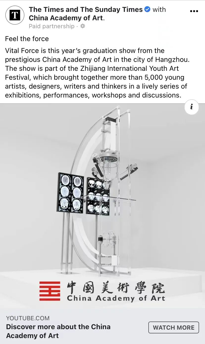 此前,《泰晤士报》官方脸书账号“The Times and The Sunday Times”在发布预热推文时,文章的主笔编辑伊恩·贝尔彻认为,今年中国美术学院毕业展的主题“生活力”恰逢其时。毕业展鼓励学生们反思我们的生活正在发生的变化,以及世界如何适应由技术的快速变革带来的影响。