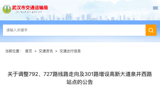 为方便市民出行,拟从2022年8月13日起,调整公交792路中途走向,727路回行走向,301路去行增设高新大道泉井西路站点。具体如下: