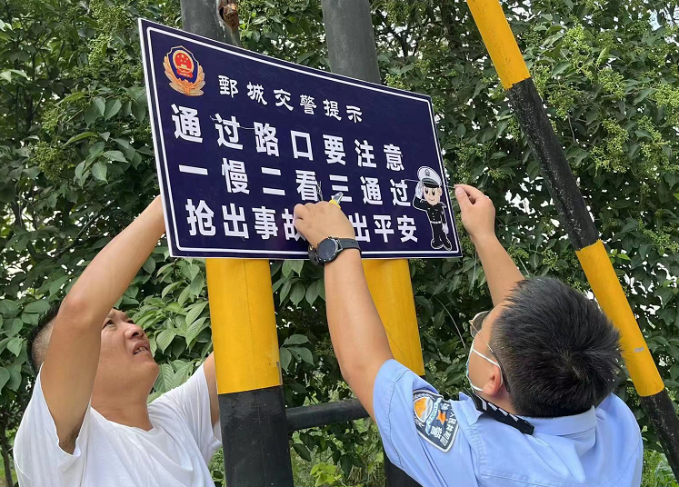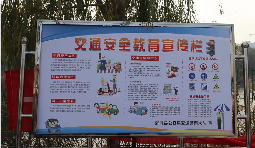 鄄城交警大队在乡镇村庄广场、沿村过镇路段、进出村路口设置维护宣传栏,安装警示标语,并利用农村广播系统大喇叭开展农村交通安全播报推送,进一步提高辖区农村地区群众的交通安全意识,从源头上预防和减少道路交通事故的发生。