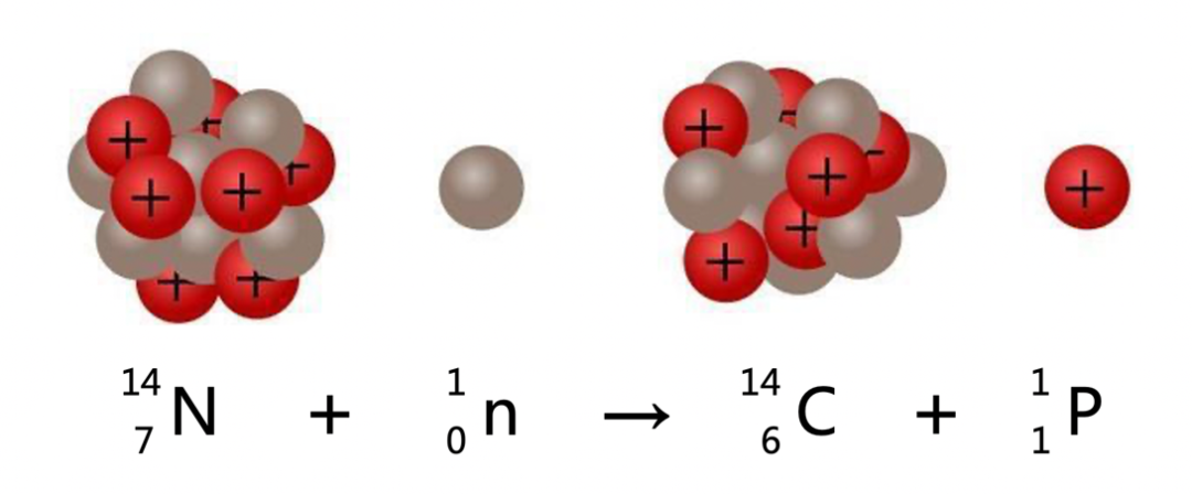 碳元素(C)是自然界中含量较高的元素,主要有三种同位素(质子数都为6,但中子数不同),即稳定同位素C-12、C-13和放射性同位素C-14。其中,C-12最常见,C-14含量较少。那么,C-14是怎么来的呢?在宇宙射线的作用下,空气中氮原子原子核中的质子数量发生改变,原来的7个质子变成了6个,形成一种分子量是14的碳同位素——C-14。