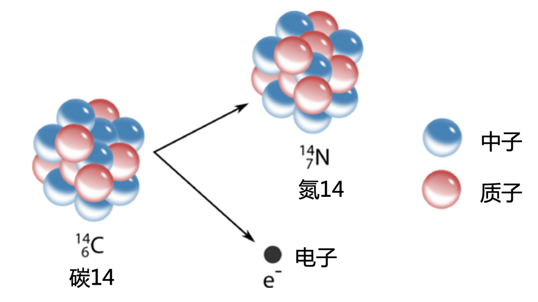 由于具有放射性,C-14会发生β衰变,变为N-14。因此,一旦生物死亡,生物遗骸中的C-14含量就逐渐减少,而碳C-12的含量保持不变。如果想要知道这一生物的死亡时间,只需测定其C-14与C-12的含量比例,并依照C-14的放射性衰变公式进行计算。C-14衰减到原来质量一半的时间,称为“半衰期”,经测定为5730年(我国采用的标准)。