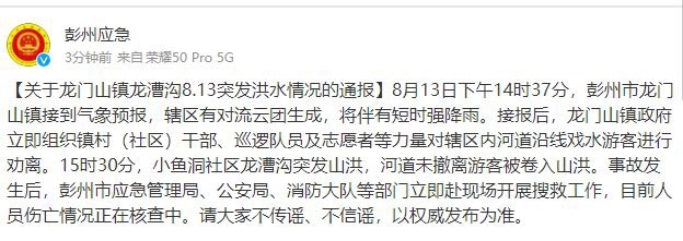 8月13日,彭州市应急管理局发布通告:8月13日14时37分,彭州市龙门山镇接到气象预报,辖区有对流云团生成,将伴有短时强降雨。接报后,龙门山镇政府立即组织镇村(社区)干部、巡逻队员及志愿者等力量对辖区内河道沿线戏水游客进行劝离。15时30分,小鱼洞社区龙漕沟突发山洪,河道未撤离游客被卷入山洪。险情发生后,彭州市应急管理局、公安局、消防大队等部门立即赴现场开展搜救工作,目前人员伤亡情况正在核查中。请大家不传谣、不信谣,以权威发布为准。