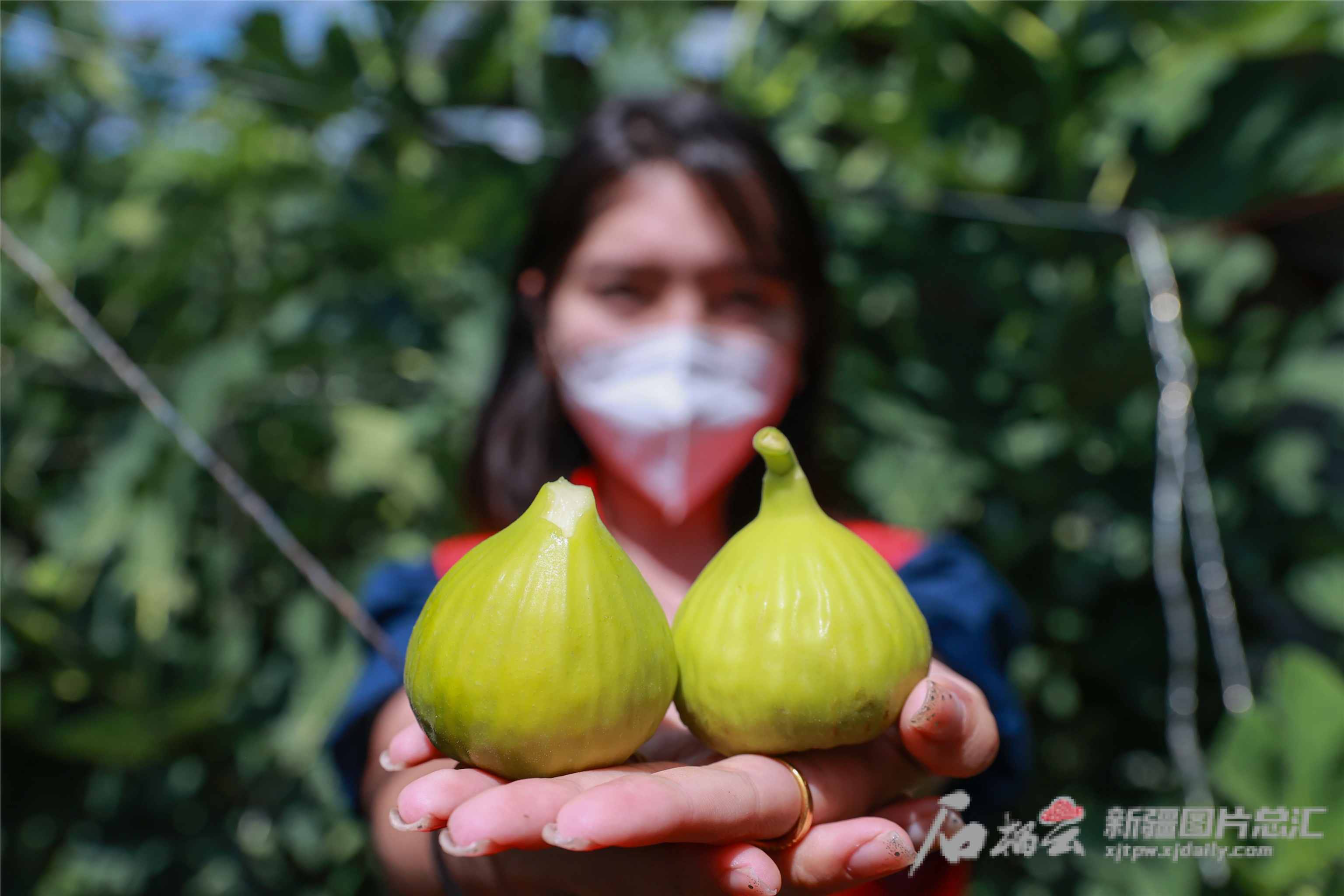 8月10日,博乐市贝林哈日莫墩乡决肯村大棚里,志愿者展示成熟的无花果。于苏甫·艾尼 摄