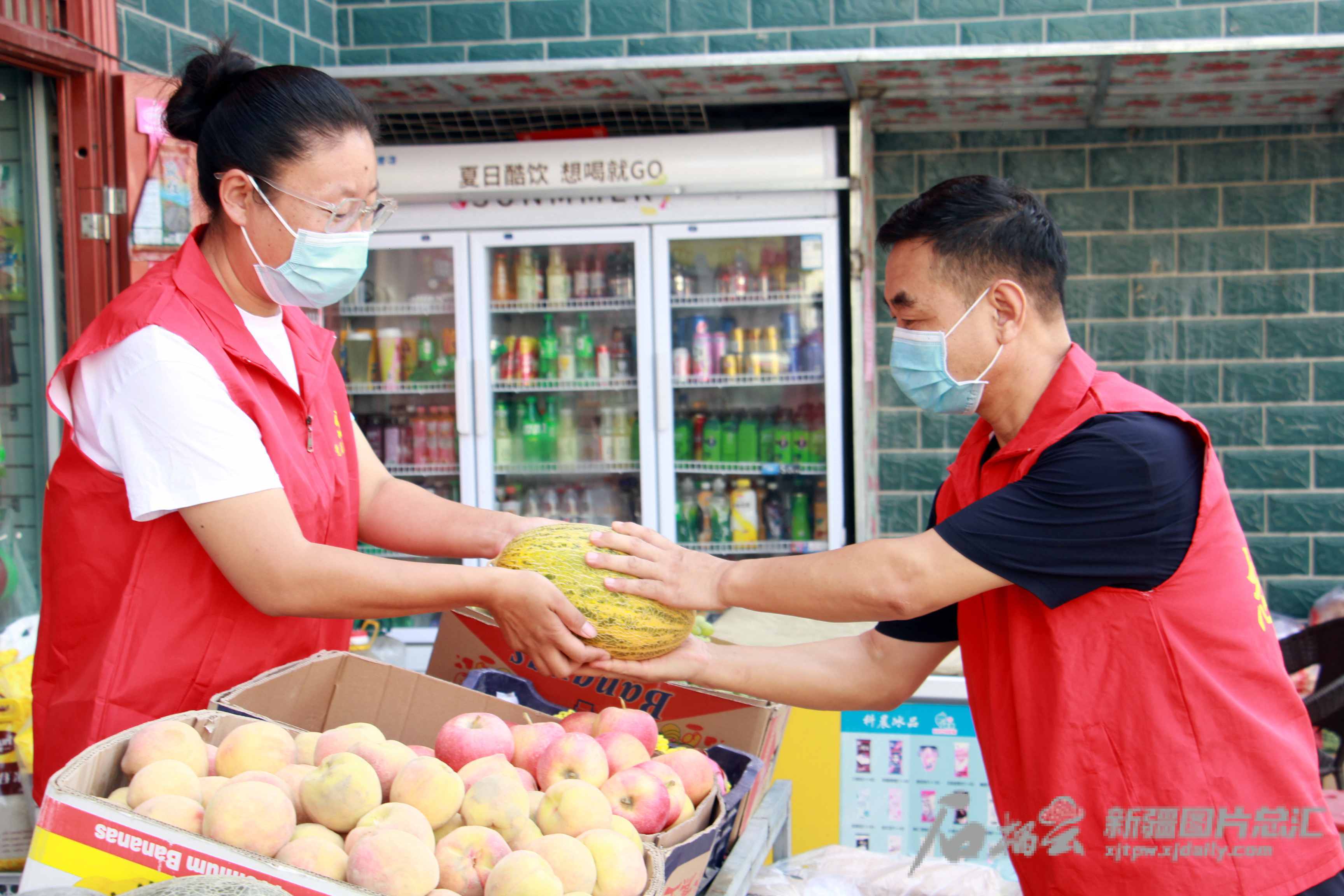 8月13日,阿瓦提县志愿者正在帮助居民购买甜瓜。包良廷 摄