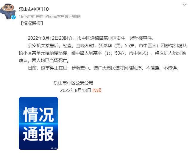 8月12日,有网友发布视频称,乐山一水果市场附近有人跳楼,并砸中一名路人。8月13日,乐山市中区公安分局对此事发布情况通报称,坠楼者与被砸中的路人均不幸身亡。