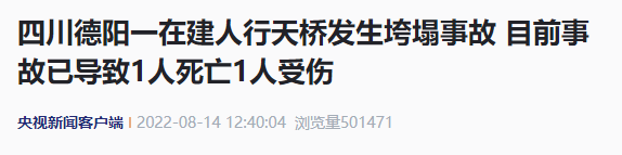 据央视新闻客户端报道,8月14日9时许,四川德阳市峨眉路南段与岷江东路交会路口一在建人行天桥在封闭施工过程中发生坍塌事故。