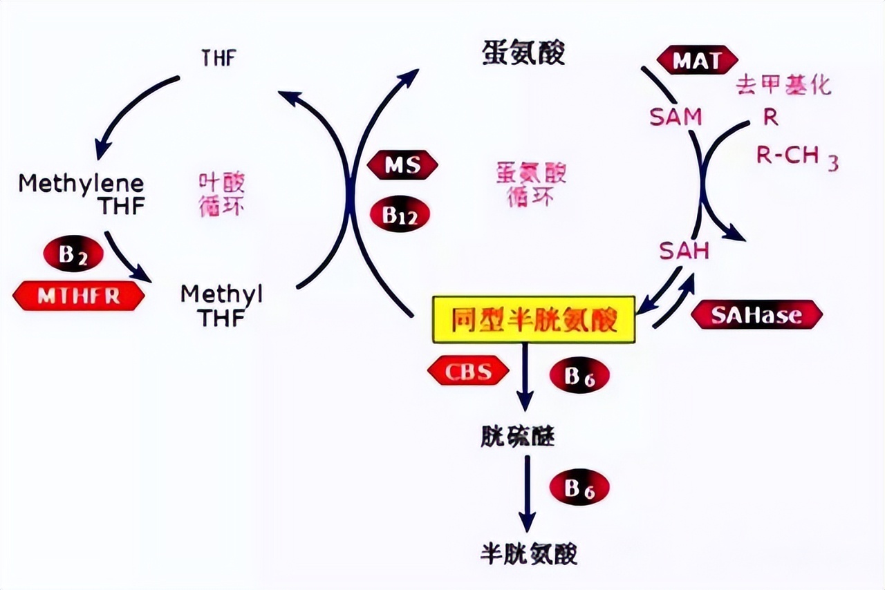 血液中的这个同型半胱氨酸,是在身体里一种氨基酸——蛋氨酸的代谢过程中间产生的,属于“中间代谢产物”。本来同型半胱氨酸这个中间产物是可以继续代谢、再去生成蛋氨酸的,但是由于人体缺乏了一些酶或者叶酸、B族维生素,就代谢不下去了,血同型半胱氨酸就增高了。
