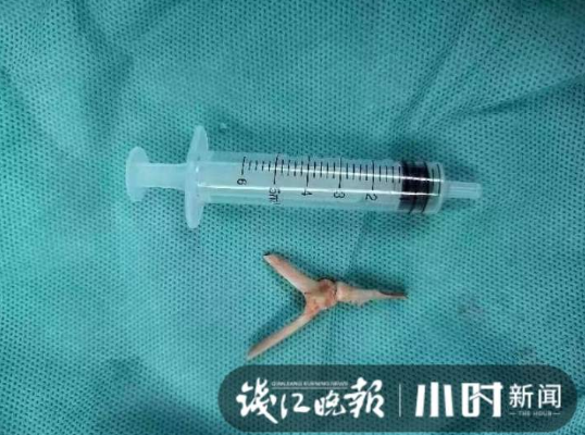 争分夺秒,头颈外科联合了消化内科、麻醉科,做了一场像“爬墙”一样一点一点取物的手术,足足进行了两个钟头,最终取出了一块三叉戟形的鸡骨。