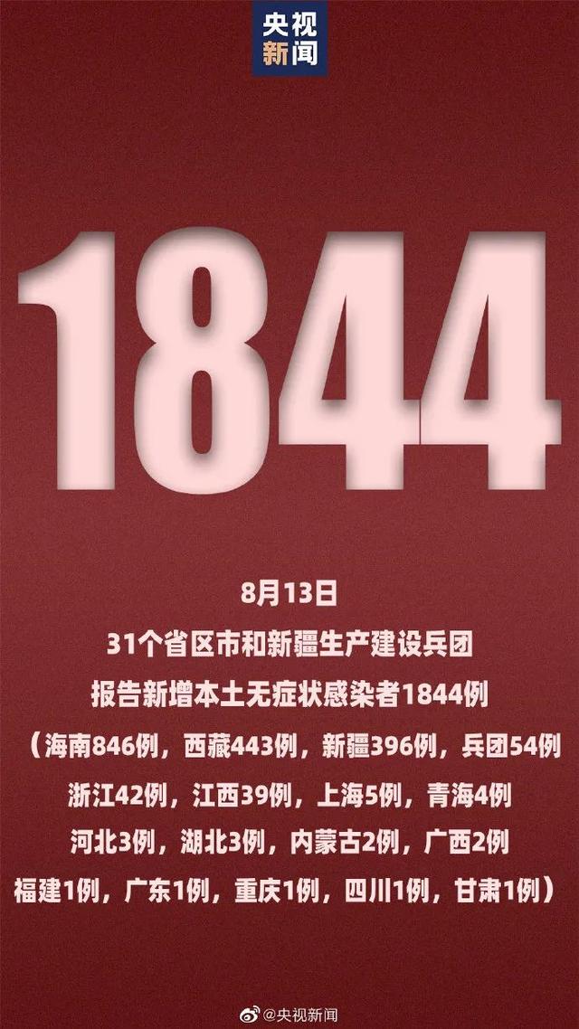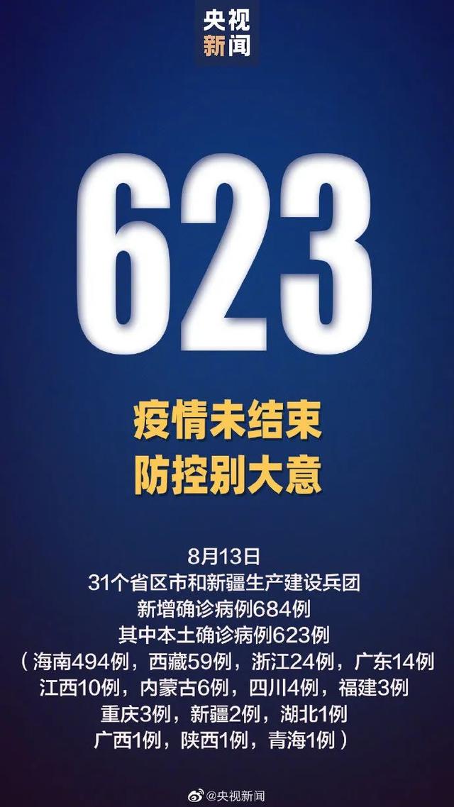 8月13日0—24时,31个省(自治区、直辖市)和新疆生产建设兵团报告新增本土确诊病例623例,本土无症状感染者1844例。
