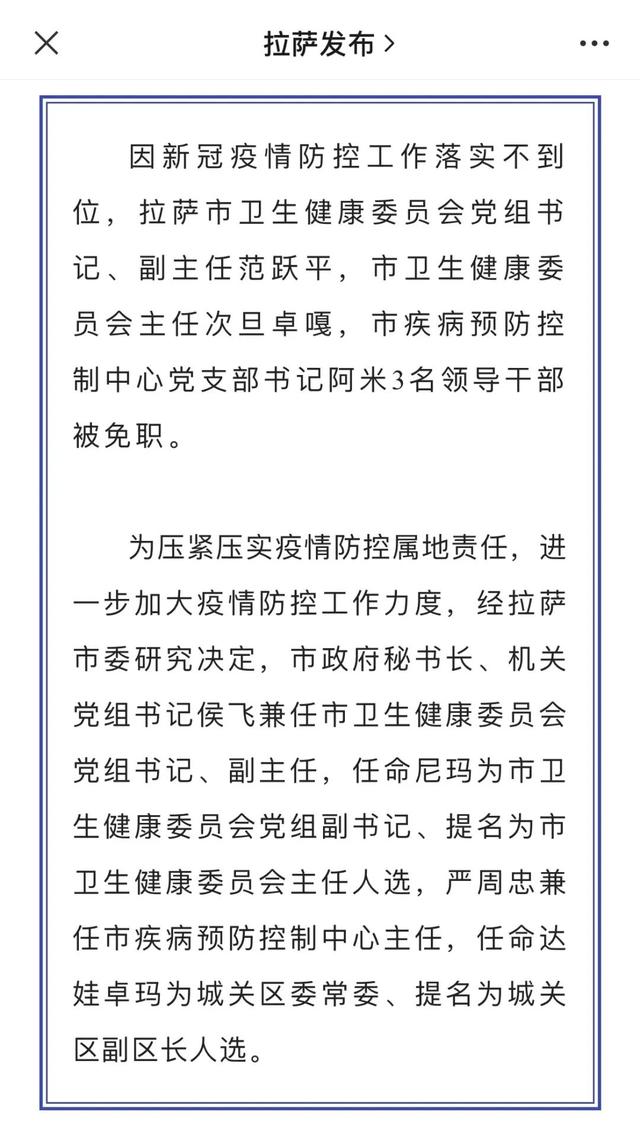 据拉萨发布,因新冠疫情防控工作落实不到位,拉萨市卫生健康委员会党组书记、副主任范跃平,市卫生健康委员会主任次旦卓嘎,市疾病预防控制中心党支部书记阿米3名领导干部被免职。