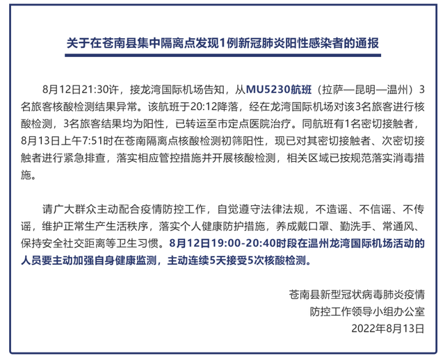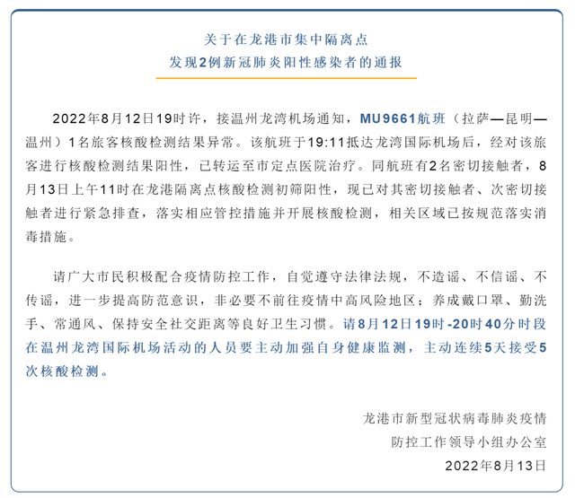8月13日,浙江温州发布通报称龙湾国际机场发现4例阳性,涉及MU9661、MU5230两个航班。MU9661航班所有旅客及机组人员已全部集中隔离。