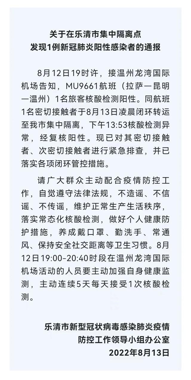 MU9661航班1名密接者,在乐清市集中隔离点核酸检测异常,经复核阳性。