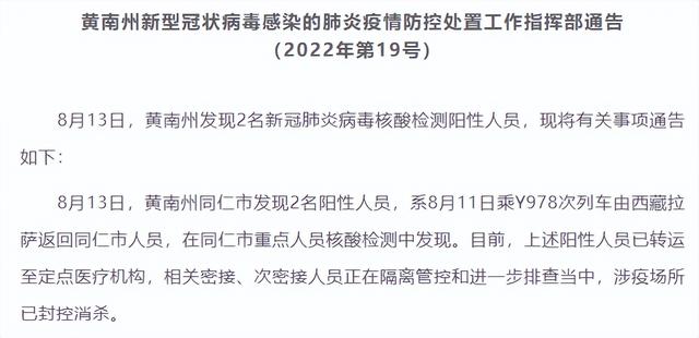 8月13日,青海黄南州发现2名新冠肺炎病毒核酸检测阳性人员,系8月11日乘Y978次列车由西藏拉萨返回同仁市人员。