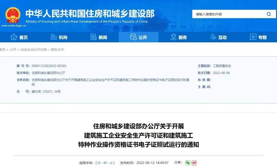 住建部8月12日发文,决定开展建筑施工企业安全生产许可证和建筑施工特种作业操作资格证书电子证照(下称电子证照)试运行。