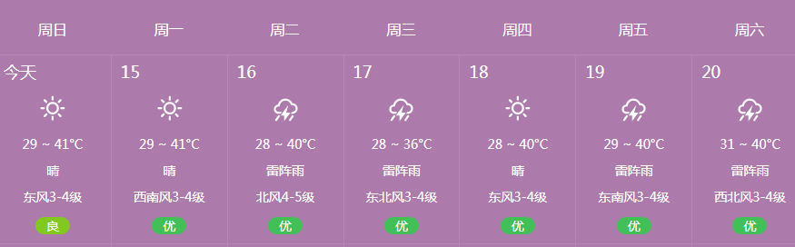 未来一周,酷热依然是天气的主旋律,最高气温37~41℃,局部将达到41℃以上。在副热带高压的牢牢把持之下,大范围的降雨过程不会出现,但是在16-17日和20日午后将有雷阵雨,雷雨时局部有短时大雨到暴雨、8~10级个别11级以上雷雨大风等强对流天气。