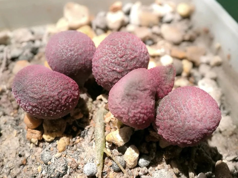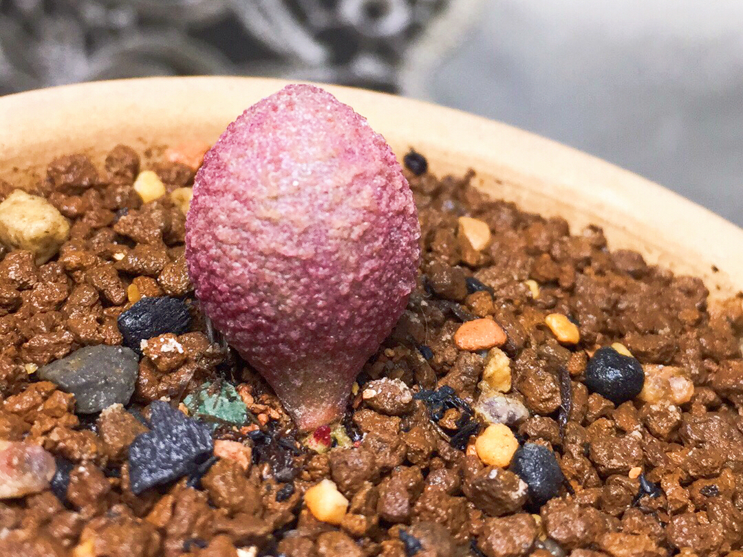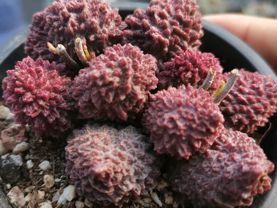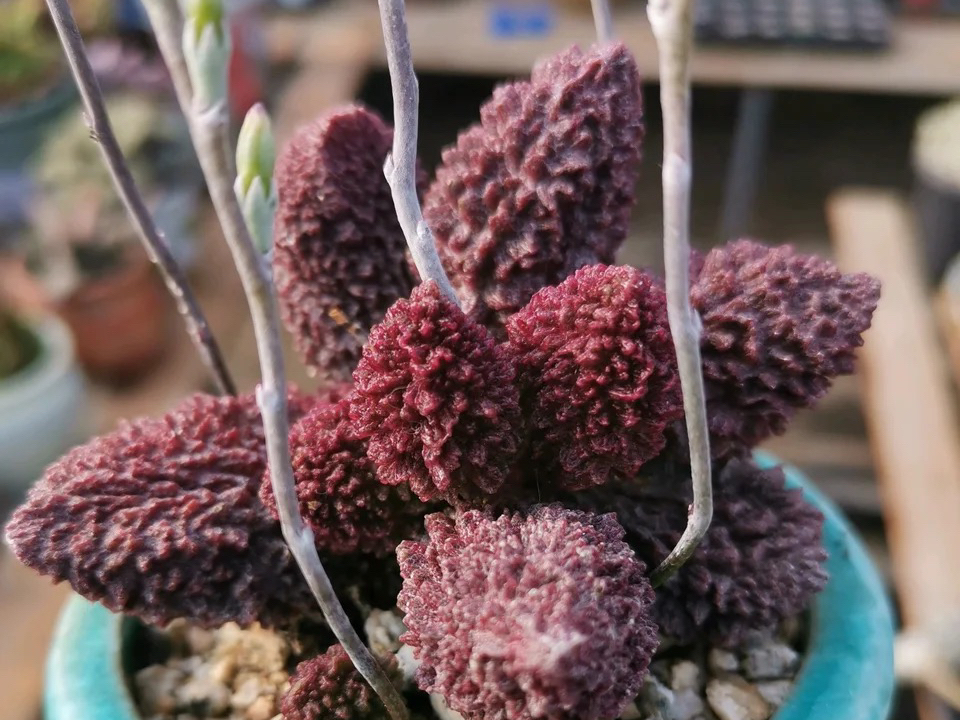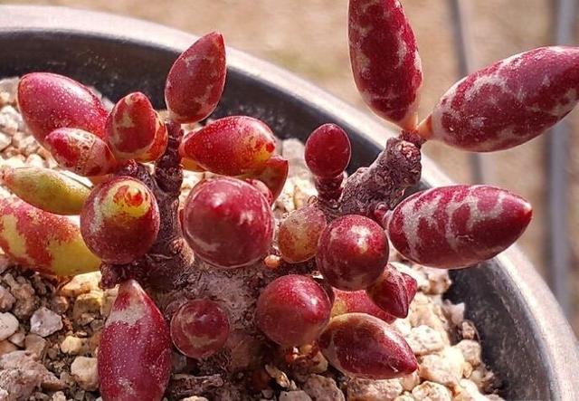 朱紫玉是水泡系列当中根系最强健的品种了,不少喜欢玩盆栽的花友,都会把朱子玉养成那种造型精致的样子,这一点和沙漠玫瑰和金枝玉叶有点像,在欣赏颜色的同时,还能欣赏根系的造型。它们的叶片呈现纺锤形,中间肥两边尖,表面粗糙布满小疣点,出状态的时候呈现紫红色,非常漂亮。