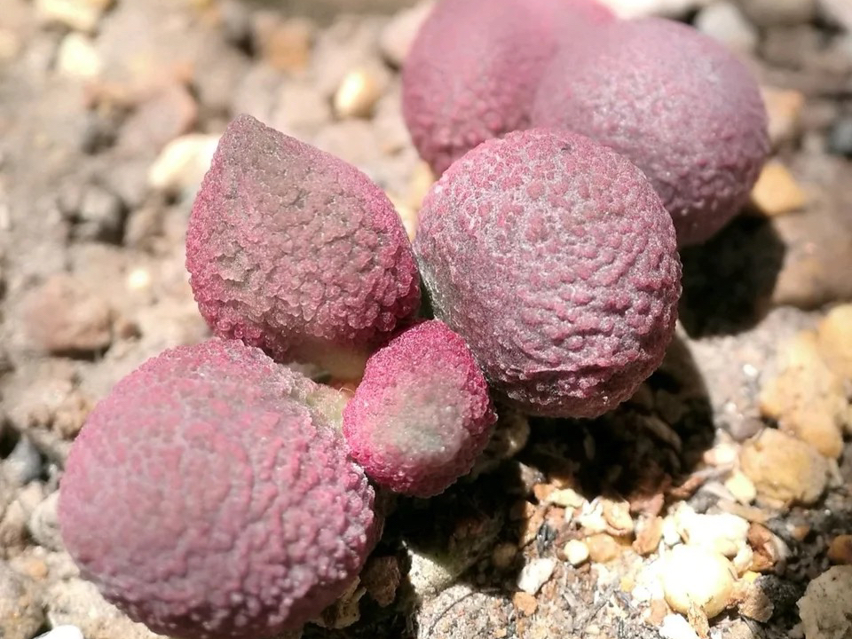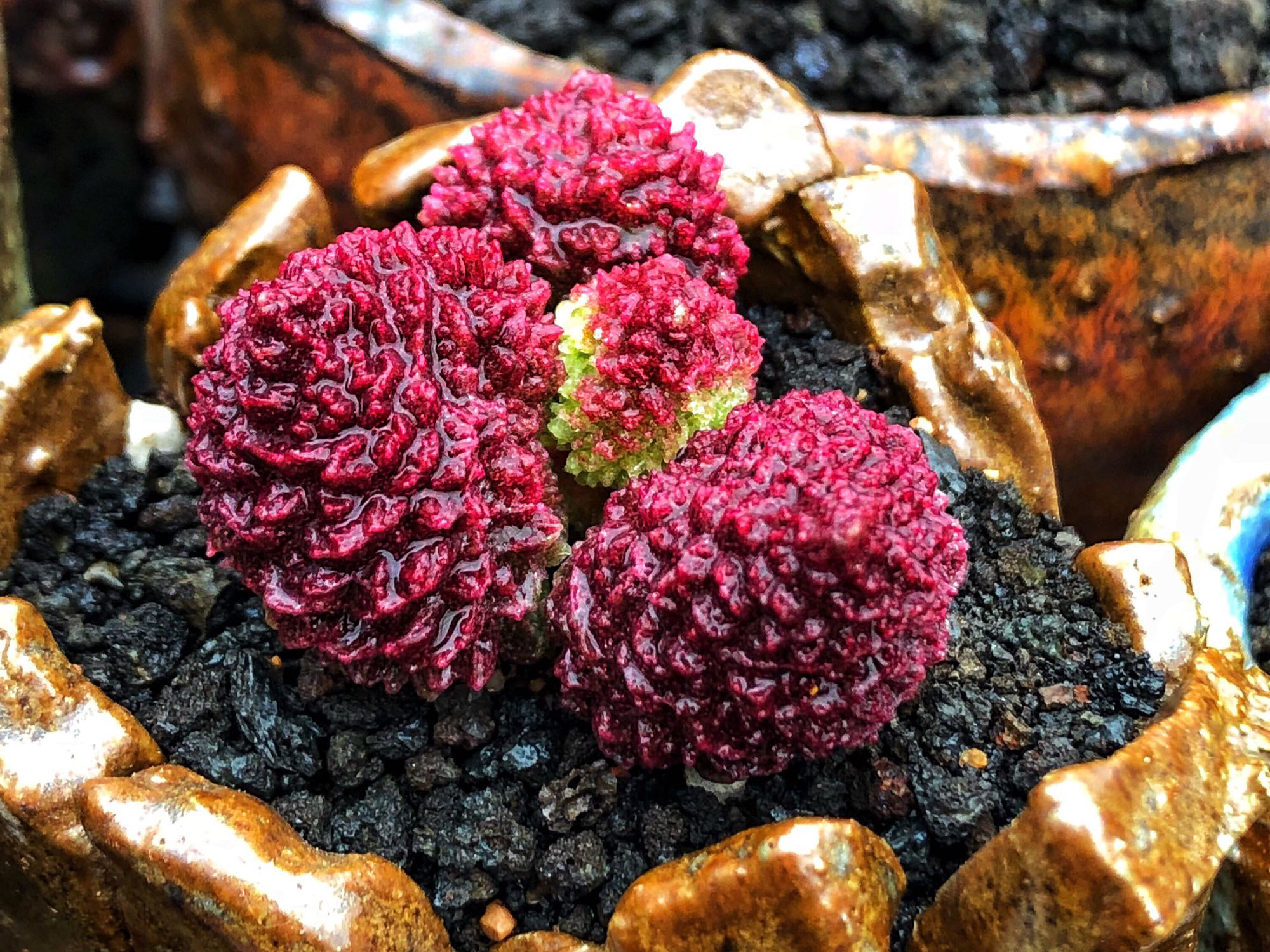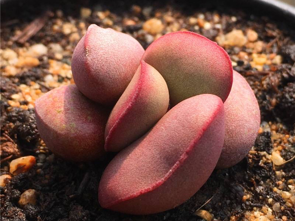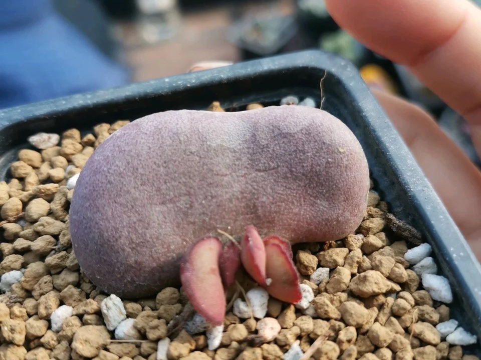 朱紫玉是水泡系列当中根系最强健的品种了,不少喜欢玩盆栽的花友,都会把朱子玉养成那种造型精致的样子,这一点和沙漠玫瑰和金枝玉叶有点像,在欣赏颜色的同时,还能欣赏根系的造型。它们的叶片呈现纺锤形,中间肥两边尖,表面粗糙布满小疣点,出状态的时候呈现紫红色,非常漂亮。