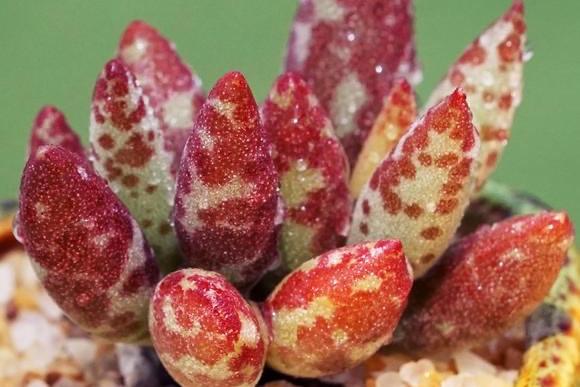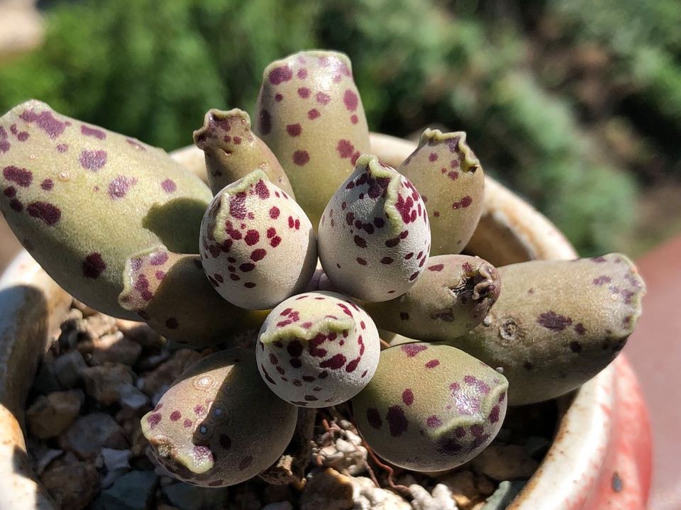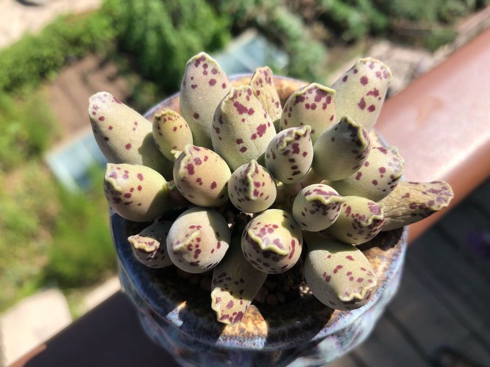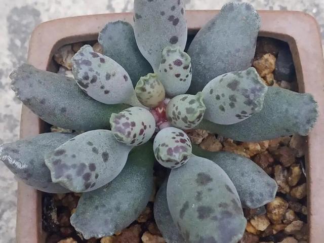 梅花鹿和水泡一样,都是属于用来欣赏斑点的水泡系多肉,价格也很便宜,它们的叶片相对来说比较规则,出状态的时候叶片上的斑点会变成紫红色,极致状态下整个叶片都会变红,它们的直立性比较强,容易长杆子,而且群生能力非常强,是水泡系多肉中最好养的品种了。