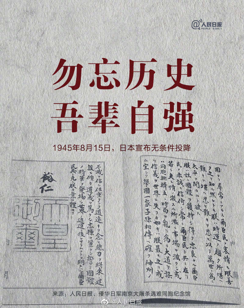 1945年8月15日,日本天皇裕仁发布《终战诏书》,宣布无条件投降。14年抗战期间,中国付出巨大代价:一半国土被日寇践踏,930余座城市被侵占,军民伤亡3500万人以上……山河日新,国力日强,但曾经的血与泪不能忘、不敢忘!日本战败投降77周年,铭记历史,吾辈自强!