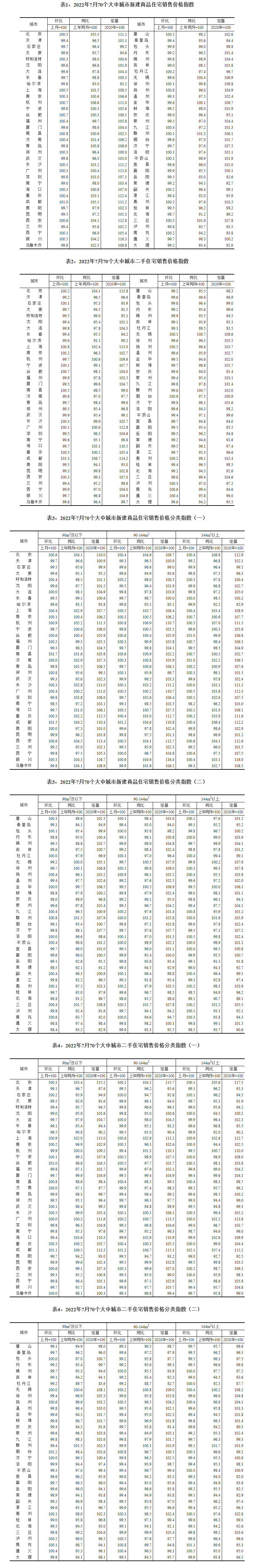 2022年7月份,70个大中城市中商品住宅销售价格下降城市个数略增。一线城市商品住宅销售价格环比微涨、同比涨幅回落,二三线城市环比整体呈降势、同比降幅扩大。