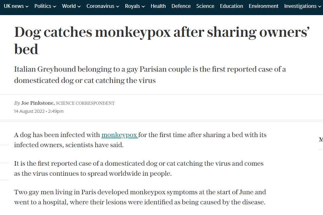 报道称,这只感染猴痘病毒的狗是法国巴黎一对男同性恋伴侣的宠物,这对情侣一直保持着“开放性关系”,二人在恋爱期间各自曾分别和其他人发生性关系,导致二人后续都感染了猴痘病毒。