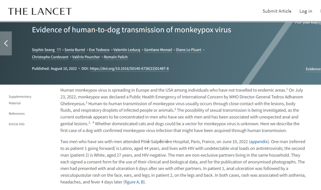 报道指出,这是目前发现的首例家养猫狗宠物从人身上感染猴痘病毒的案例。在医学杂志《柳叶刀》8月10日发布的论文中,有分析认为可能的传播途径是狗在舔主人时舌头触碰到了人身上的猴痘脓疱,随后又用舌头舔自己的身体,最终将病毒带到了自己身上。