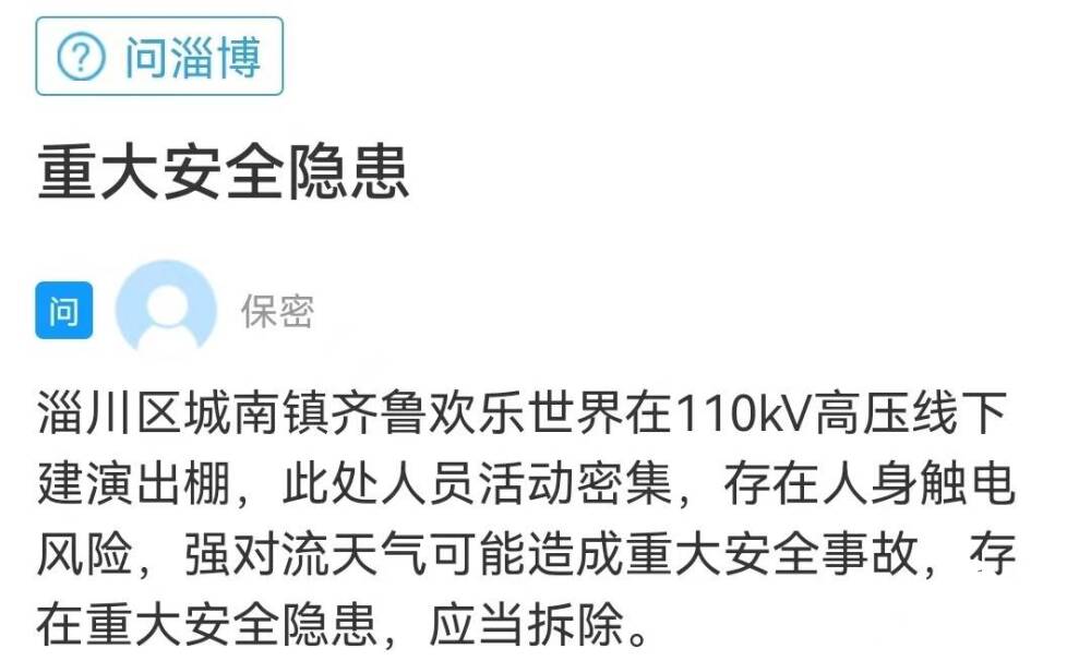 淄博市收到问题,进行了办理并回复说:立即责成淄川区政府调查处理,现将相关情况答复如下:经实地调查论证,淄博供电公司向文化和旅游局出具了《关于高压线路保护区内违法建设造成安全隐患的函》,认为在高压线下搭建马戏团大棚存在严重安全隐患并涉嫌违法。为确保游客人身安全和景区生产安全,文化和旅游局已责令景区立即停止马戏团演出,现已拆除马戏棚。