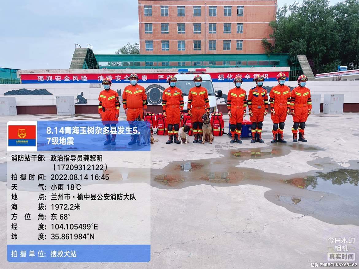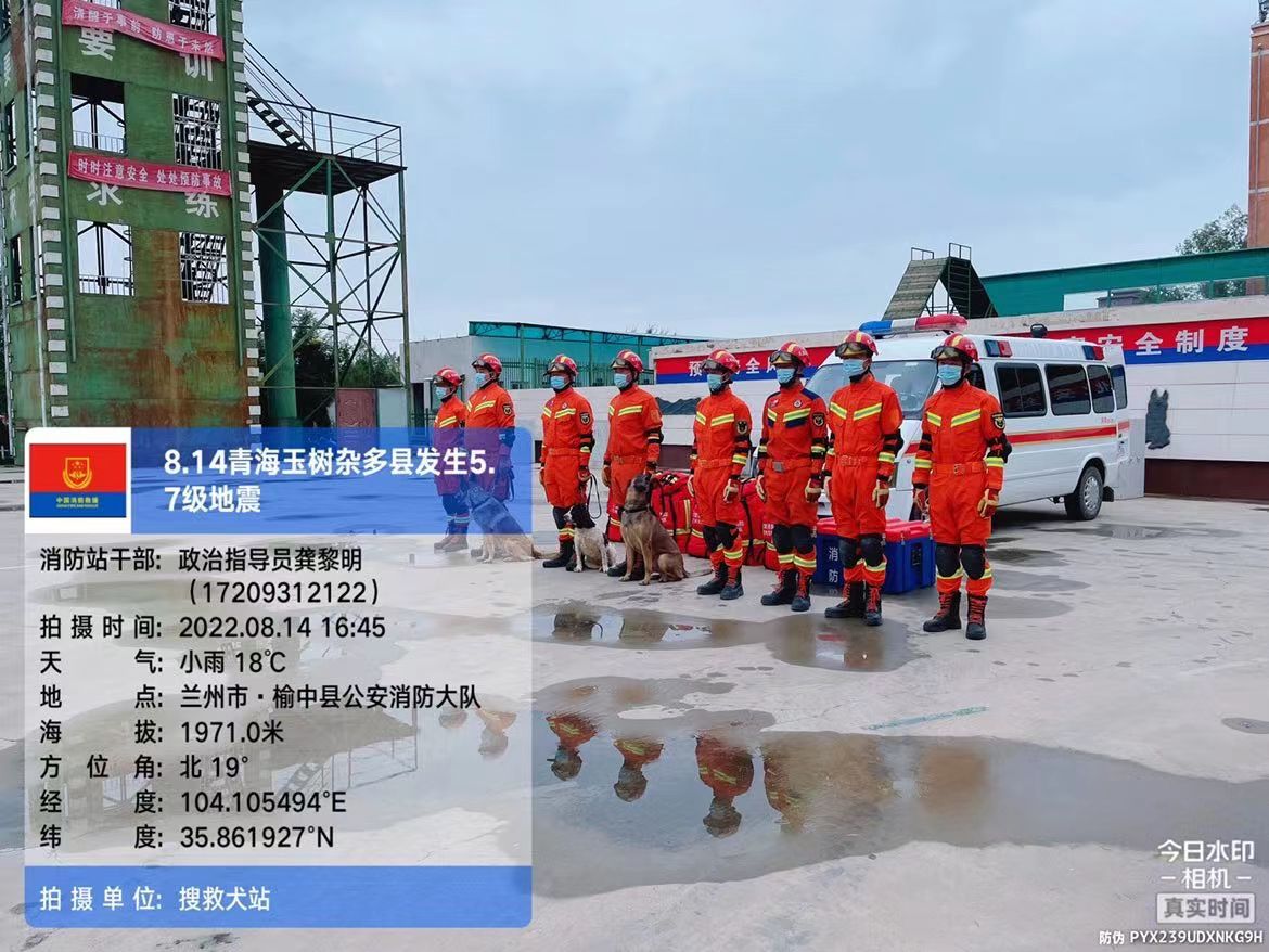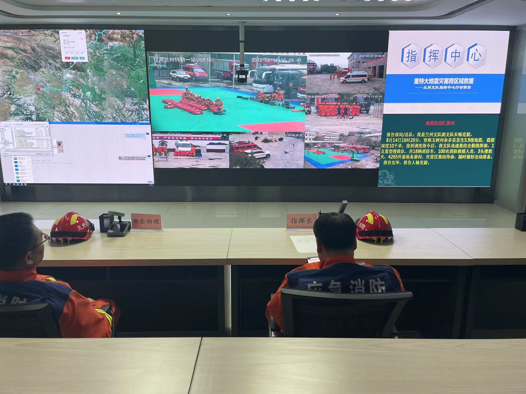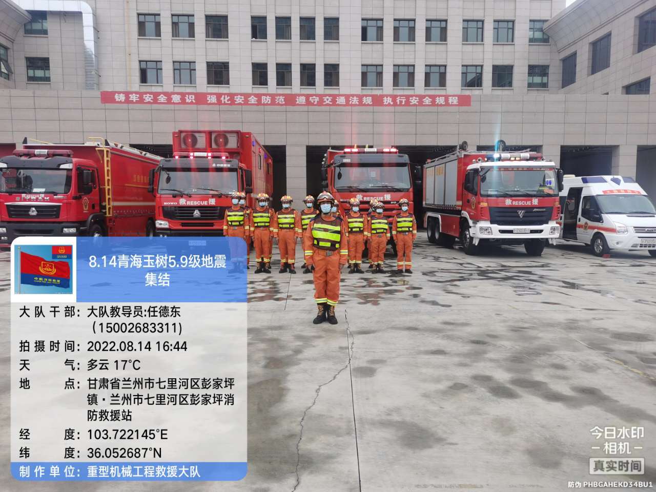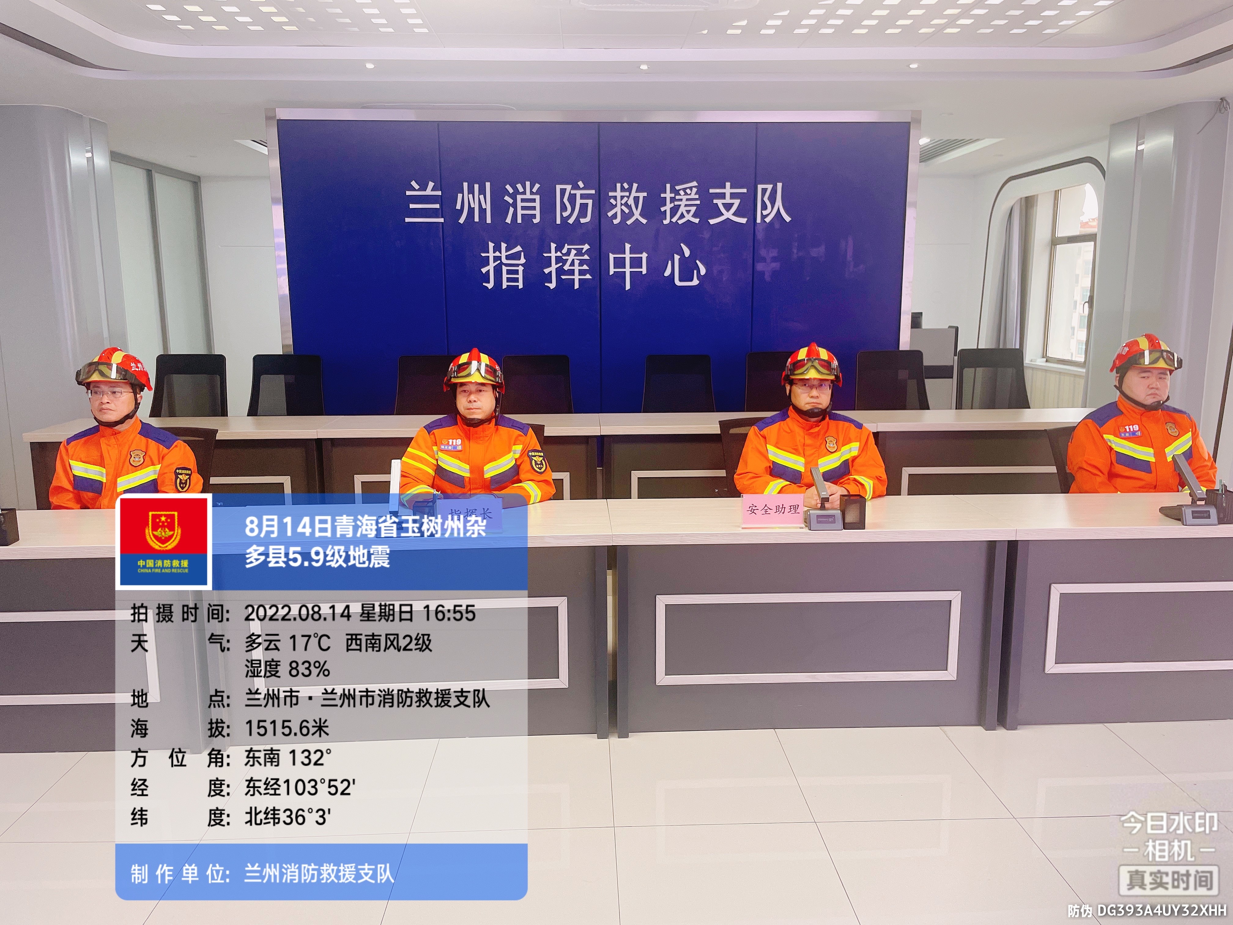 2022年8月14日16时20分,青海省玉树州杂多县(北纬33.27度,东经92.90度)发生5.7级地震,震源深度10千米,震中位于北纬33.14度,东经92.85度。震中20公里范围内人口极其稀少,距离兰州市约1224公里,地震发生后,兰州支队迅速响应,调集重型搜救队、重型机械救援大队共计约100名消防救援人员、18辆消防车、3头搜救犬、4265余件(套)装备器材在各自营区集结,当日全勤指挥长副支队长畅克毅以及全勤指挥组在指挥中心调度指挥。