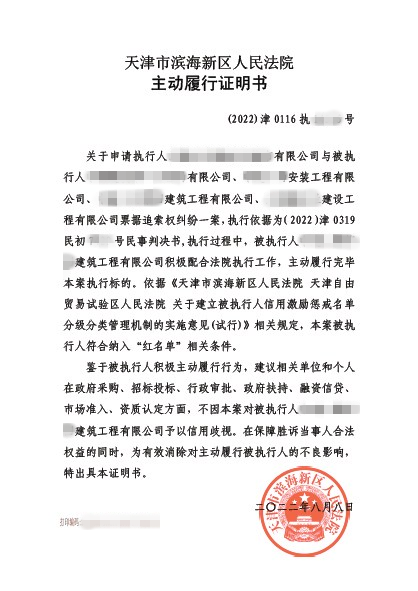 为进一步增强被执行人自动履行和积极履行生效法律文书的自觉,推动信用修复正向激励机制,规范失信名单管理工作,着力加强和助推社会信用体系建设,滨海新区法院在执行工作中推广适用信用激励及信用修复措施,近日,应被执行人申请,发出首份《主动履行证明书》。