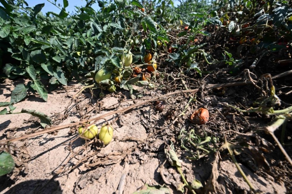 这是8月12日在意大利伦巴第大区曼托瓦拍摄的因干旱受损的西红柿。新华社发(阿尔贝托·林格里亚摄)