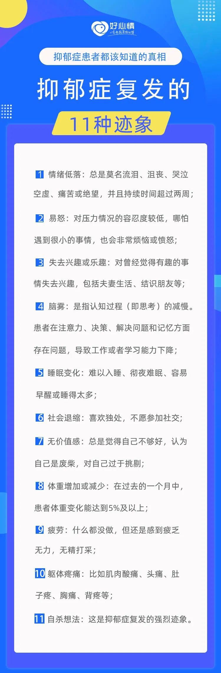 当你出现上述这些情况时,有可能是抑郁症又“卷土重来”了,一定要及时去医院就诊。