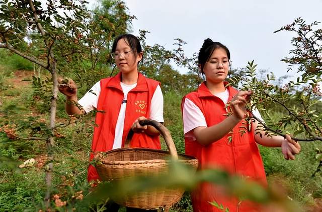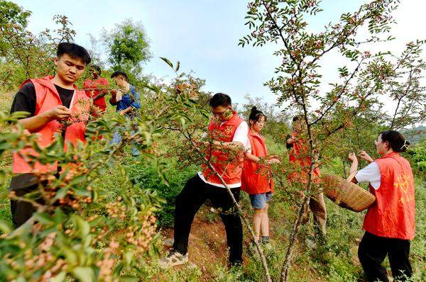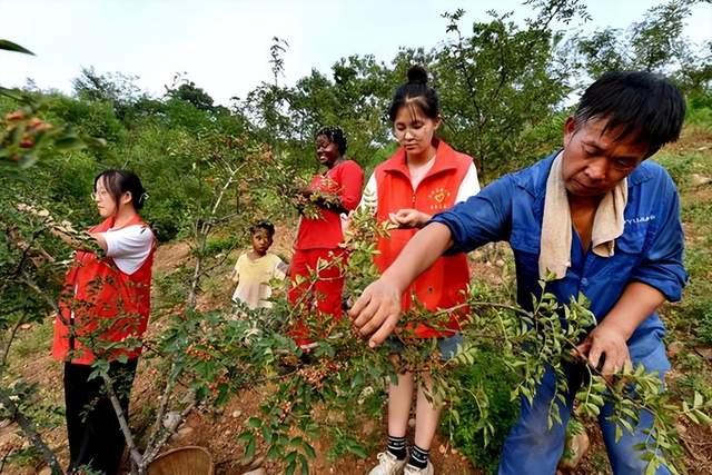8月13日下午,洛阳市孟津区城关镇组织青年志愿者,到该镇杨庄村谢晓伟和娜布利娅夫妇种植的山地花椒园里,帮助缺劳力的他们收获花椒。