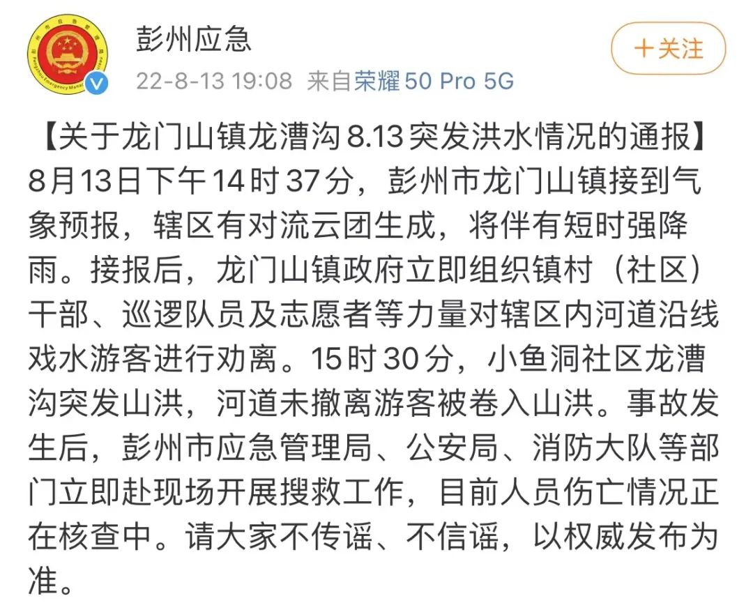 8月13日下午14时37分,彭州市龙门山镇接到气象预报,辖区有对流云团生成,将伴有短时强降雨。接报后,龙门山镇政府立即组织镇村(社区)干部、巡逻队员及志愿者等力量对辖区内河道沿线戏水游客进行劝离。15时30分,小鱼洞社区龙漕沟突发山洪,河道未撤离游客被卷入山洪。事故发生后,彭州市应急管理局、公安局、消防大队等部门立即赴现场开展搜救工作,目前人员伤亡情况正在核查中。请大家不传谣、不信谣,以权威发布为准。